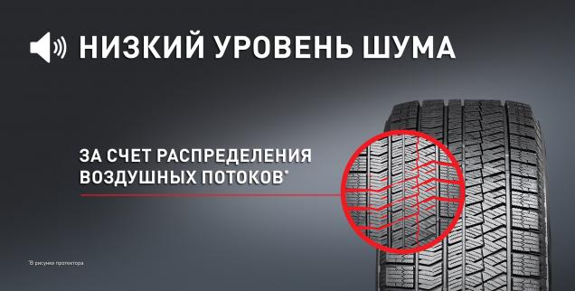 Низкий уровень шума достигается за счет распределения воздушных потоков в протекторе.